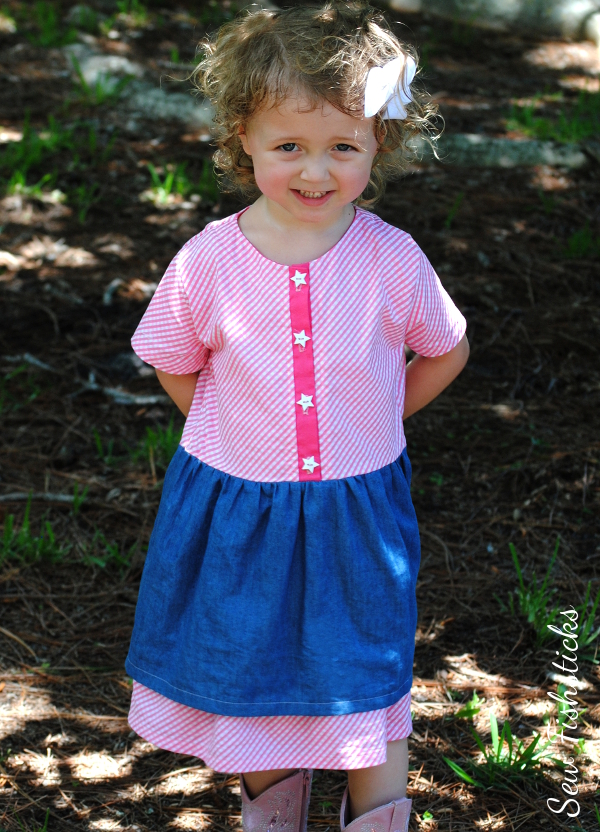Our granddaughter, Katie, turned three this month, and we celebrated last weekend with a Sheriff Callie-inspired birthday party. It’s sort of a given that I’ll get to sew her party dress (YAY!), and I had so much fun with this one!